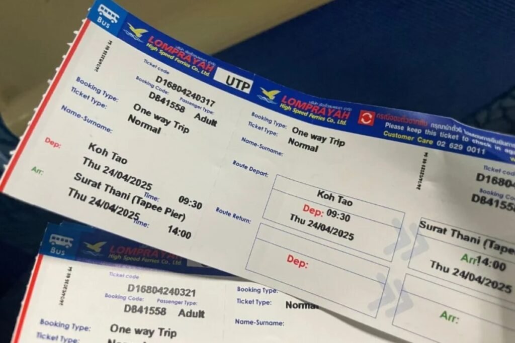On our trip, we traveled from Koh Tao to Khao Sok National Park. This involved a combination of ferry and minivan or ferry, bus, and minivan. You can book these combo tickets through platforms like 12go.asia ↗ or at local travel agencies. Important: Make sure to book at least 24 hours in advance, preferably earlier. If you wait too long, tickets for the next day are often no longer available or already sold out.