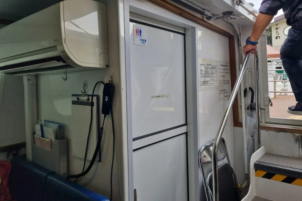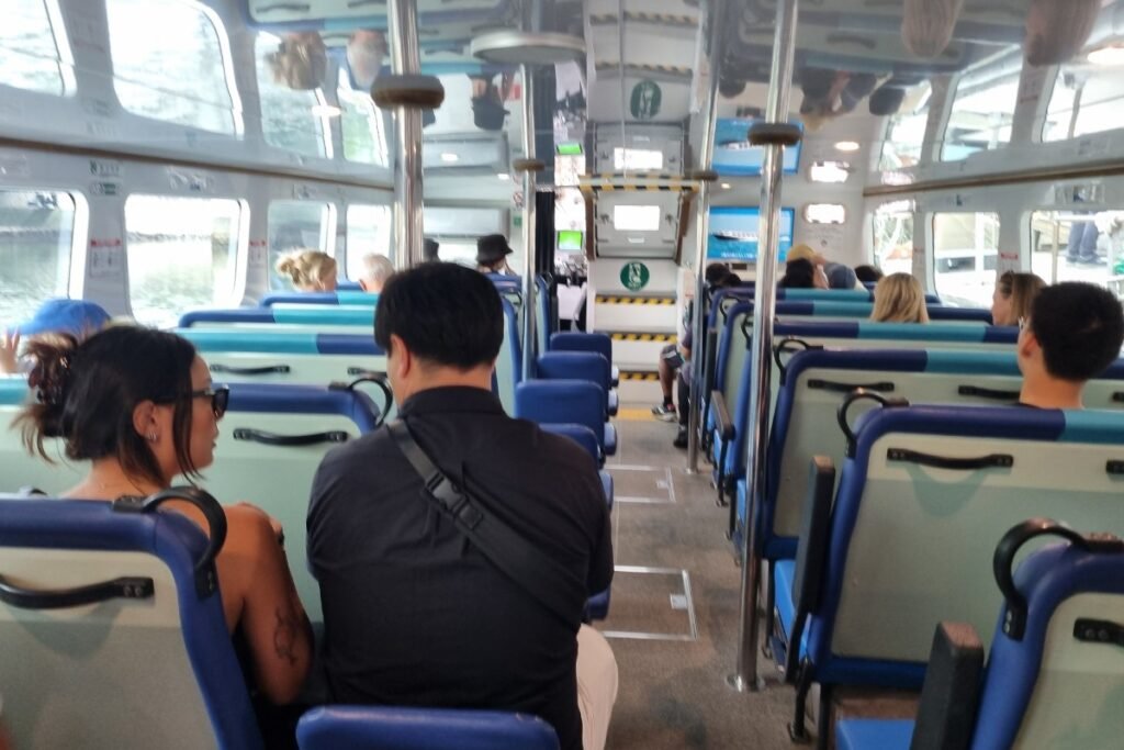 Fiveteen minutes before departure a new line begins to form. We decide to join it as well. After a short wait we see the ferry approaching and docking at the pier. We are guided on board and walk down a small staircase from the deck. To be clear this is a very small ferry with no facilities. It is best compared to a simple boat on the water.