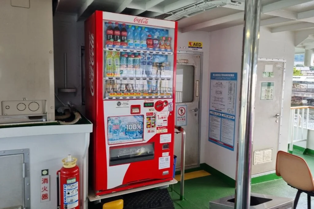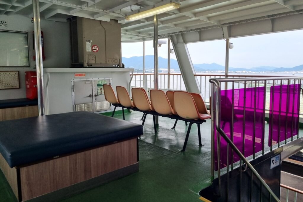 The ferry departs every half hour. After waiting for about fifteen minutes we board. This ferry is much larger than the one on our outbound trip. There is an upper deck there is space for cars there are a few snack machines and there is even a lounge area.