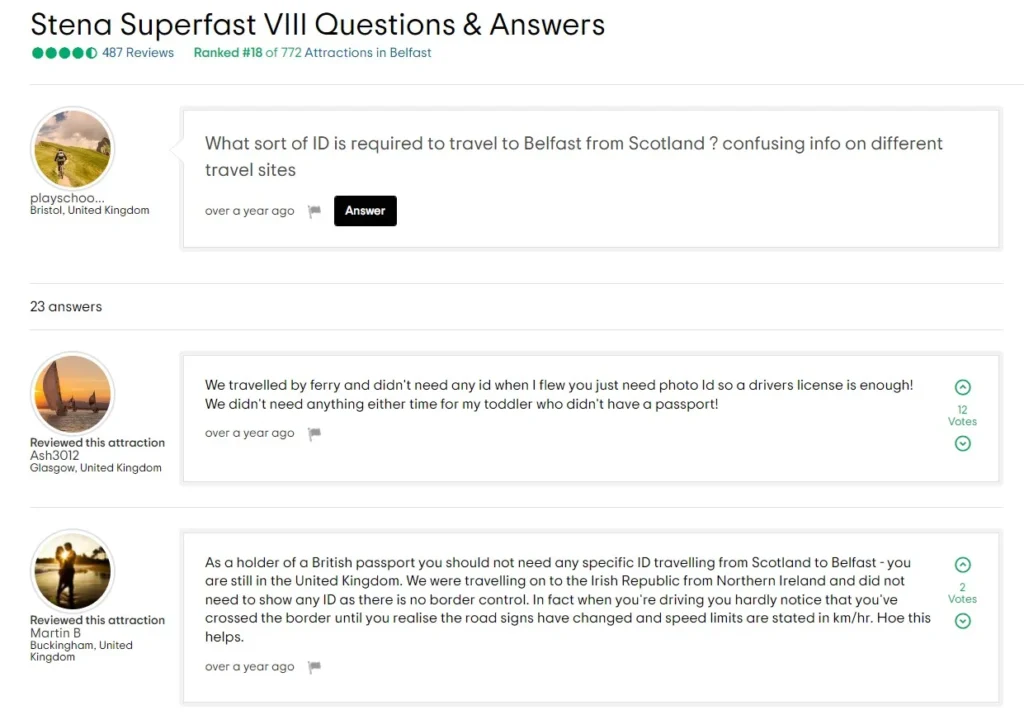 | Britain – Northern Ireland & Northern Ireland – Britain | DFDS, P&O Ferries, Brittany Ferries, Stena, Irish Ferries | When travelling from the UK to Ireland and vice versa a Passport is recommended but for Irish and UK citizens not required. You always need to be able to ID yourself, however. For non-UK and non-Irish citizens, a passport (or visa when applicable) is required. |